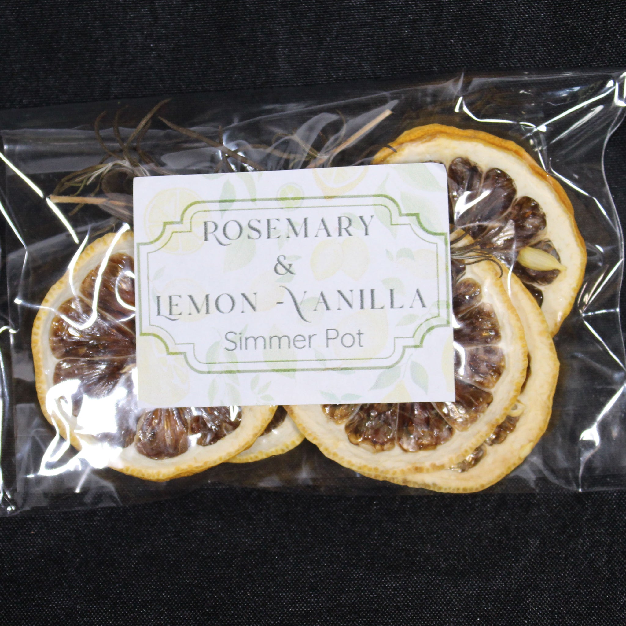 Dehydrated lemon and rosemary are infused with lemon essential oil and vanilla extract. Simmer in water to release the scent.