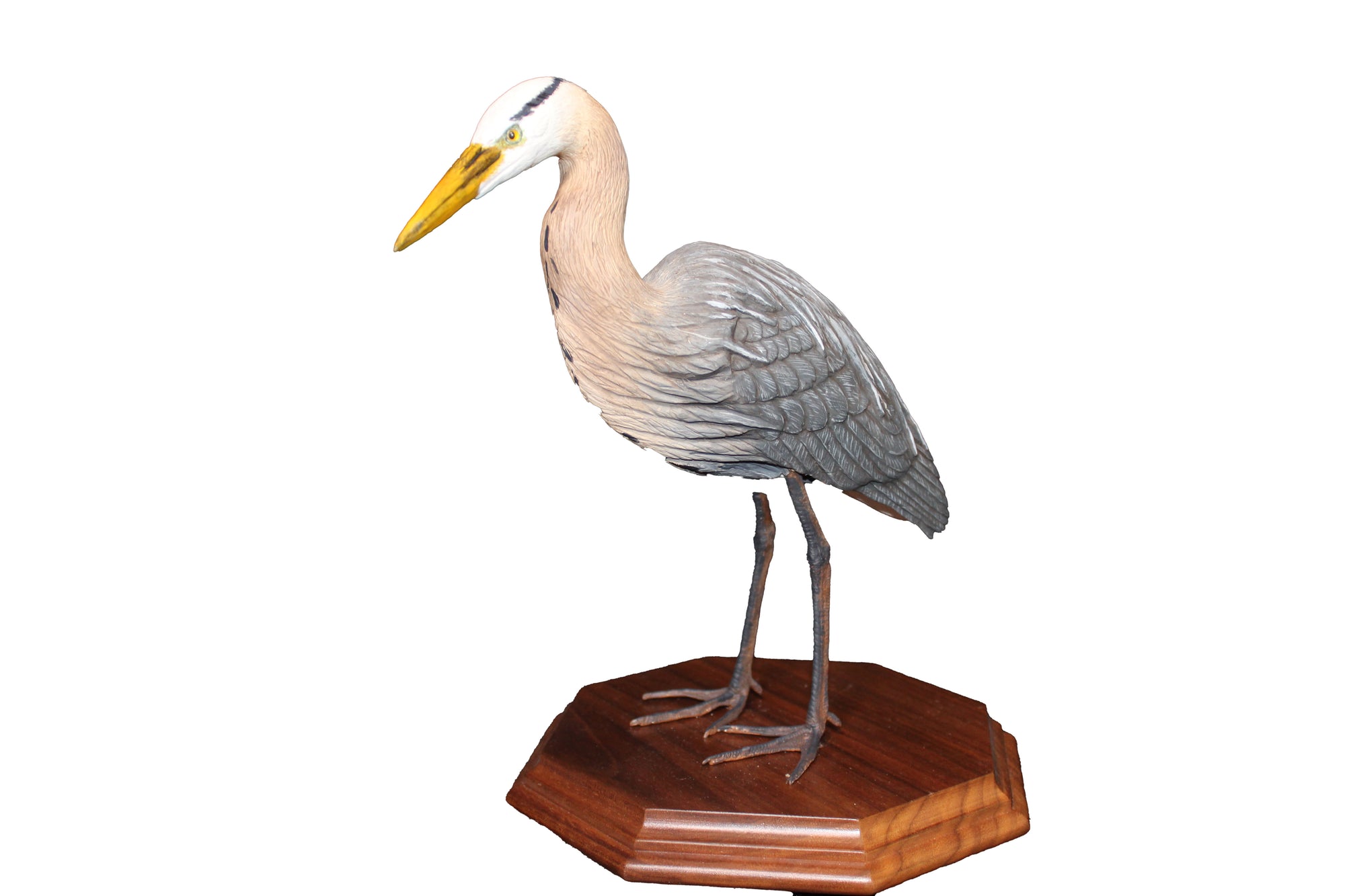 Hand carved great blue heron. It stands 8.75" on a walnut base.